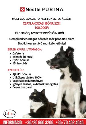 Partnerünk az állateledel-gyártás területén vezető szerepet betöltő Nestlé-Purina számára keresünk munkatársakat az alábbi pozíciókba: |