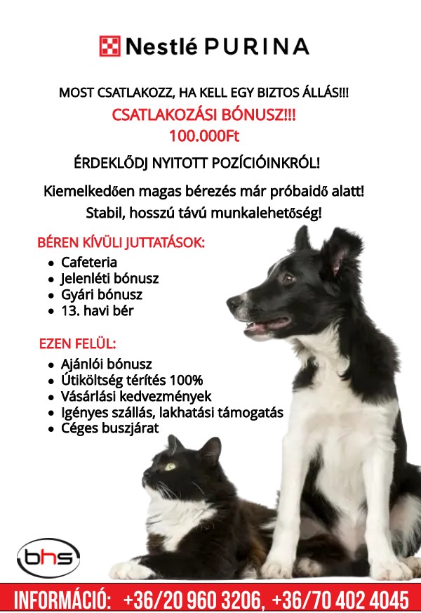 Partnerünk az állateledel-gyártás területén vezető szerepet betöltő Nestlé-Purina számára keresünk munkatársakat különböző nyitott pozíciókba